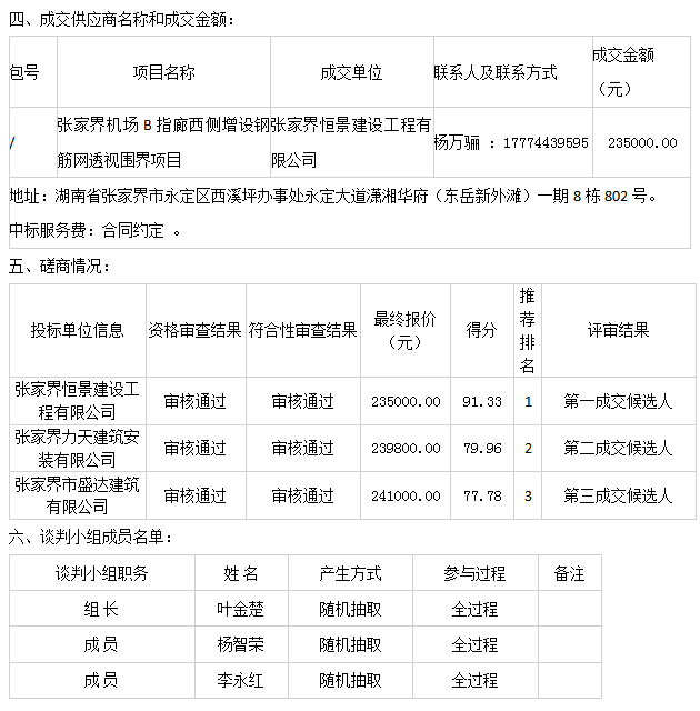 张家界机场B指廊西侧增设钢筋网透视围界项目已经于2026年03月10日评审结束,现将成交结果公告如下: